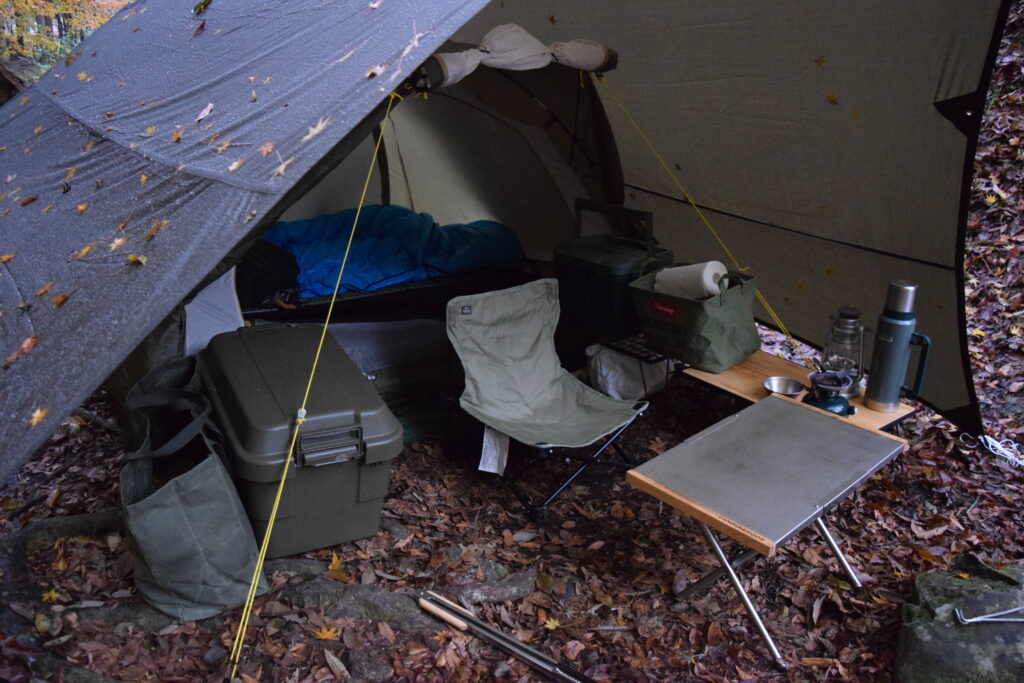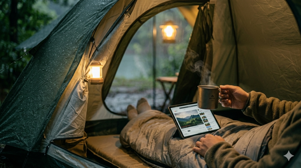 設営が終われば、あとは楽しむだけです。雨キャンプの醍醐味は、テント内での「お籠り」にあります。