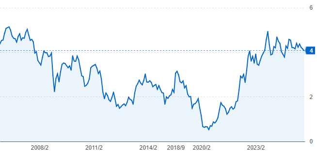 今の長期金利は4.1%程度あるわけですが、この金利の水準が高いのか低いのかを考えた時、長期のチャートを見てみると、まだ高く見えます。