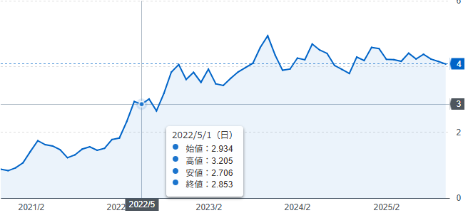 過去の長期金利を遡って3%の水準はどのあたりなのか見てみると、2022年の5月頃です。