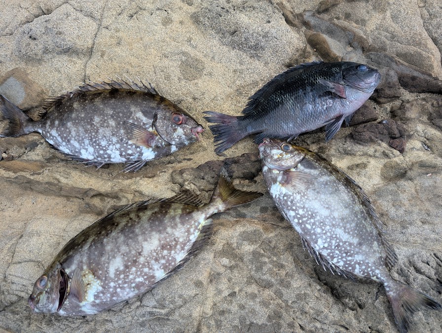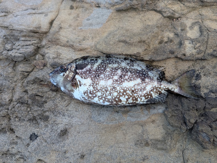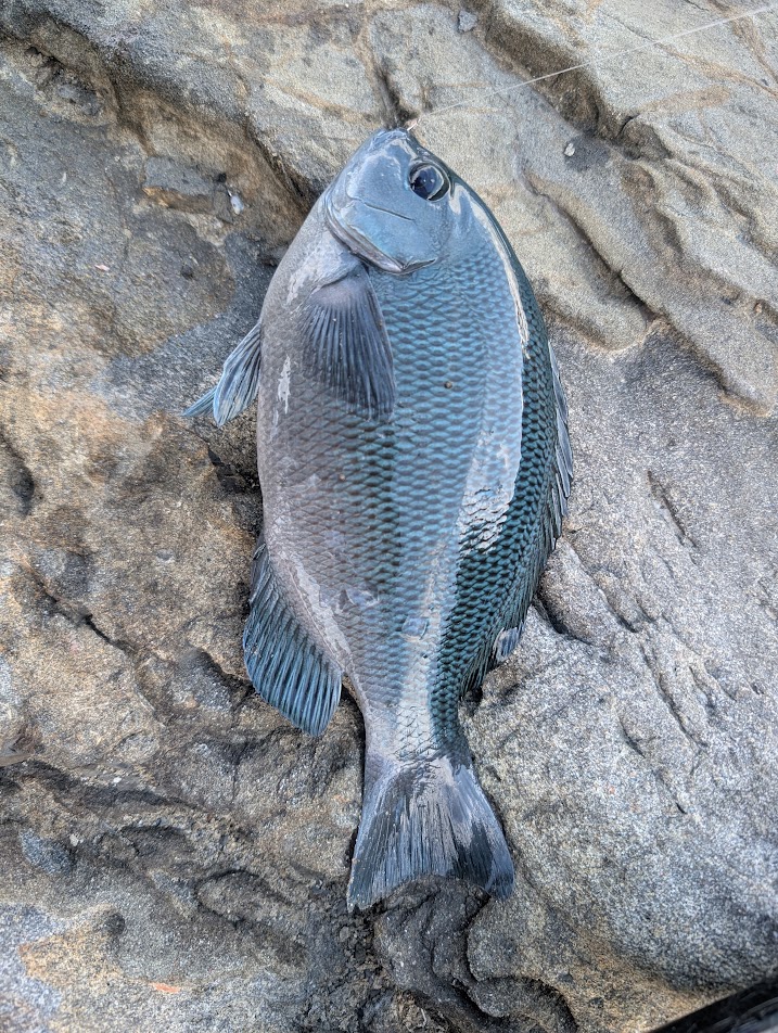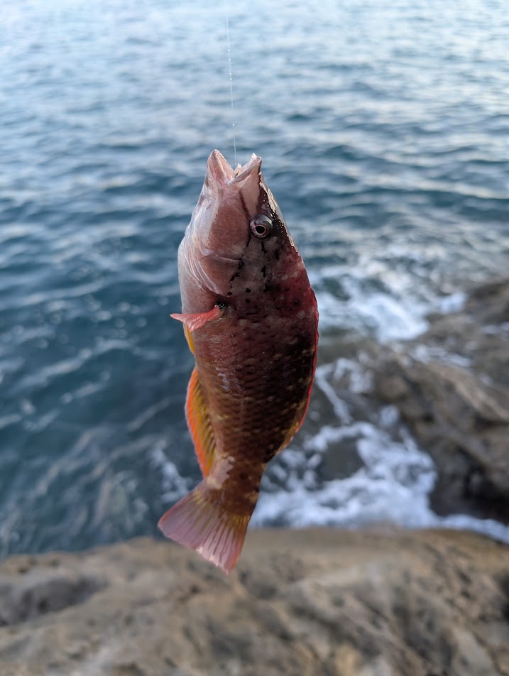 久しぶりのフカセ釣りのアタリを体感し、テンションが上がります。ですが、釣れたのは期待とは裏腹に20cm位の磯ベラです。
