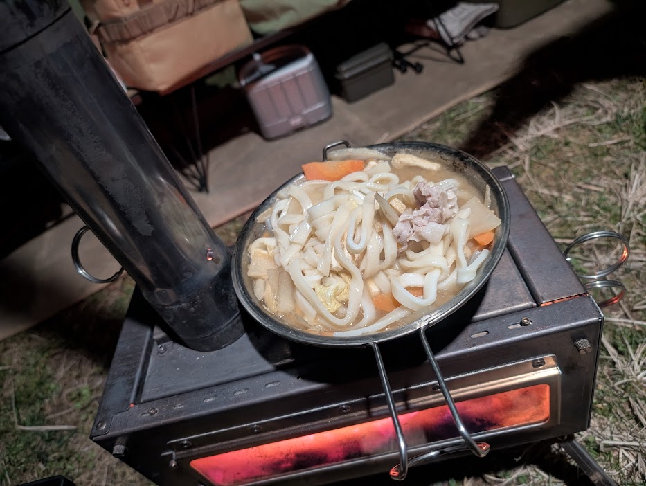 薪ストーブがパチパチとはぜる音を聞きながら、温かい「きしめんほうとうもどき」を啜ります。