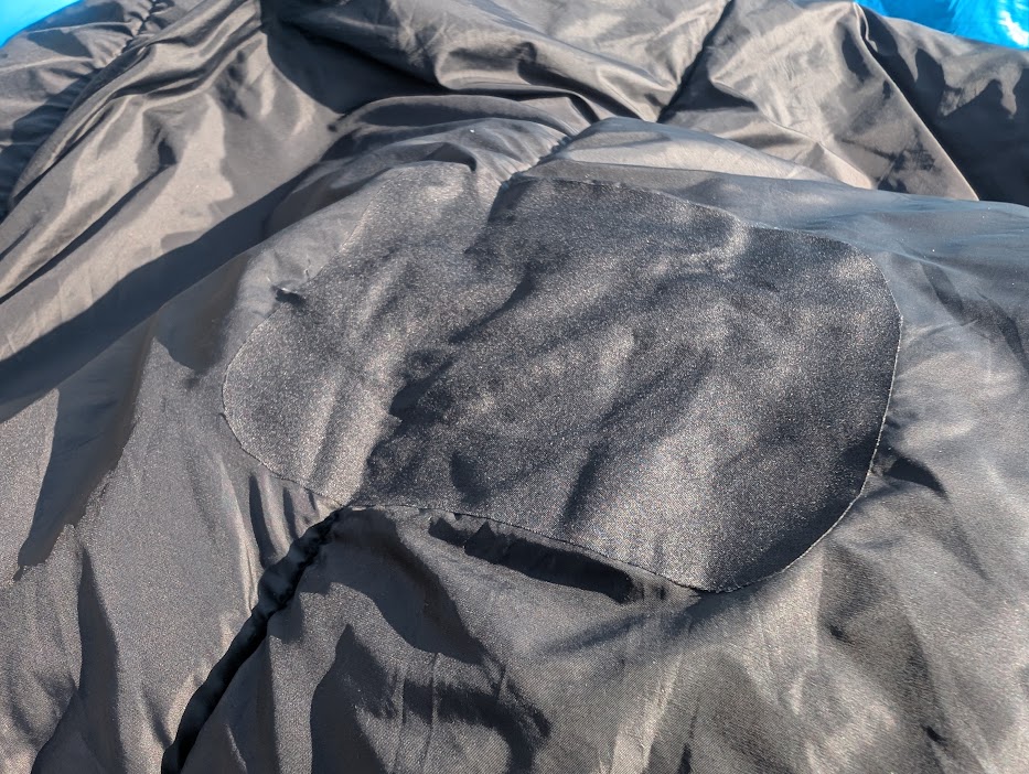 実は前回のキャンプで、薪ストーブにタラスブルバのダウンシュラフが触れてしまい、ガッツリと穴を開けてしまうという痛恨のミスを犯してしまったのですが、購入しておいた補修シールを貼ってリペア済みです。