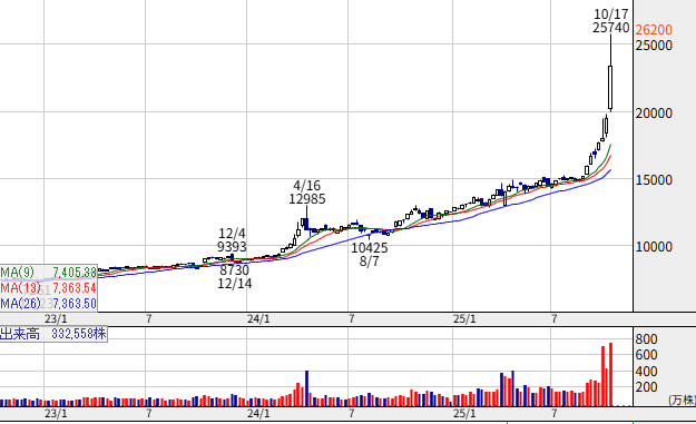 各移動平均線は上向きに揃っていて、出来高を伴った上昇で、典型的な強気トレンドですが、このような急激な上昇は一時的な天井懸念も伴います。
