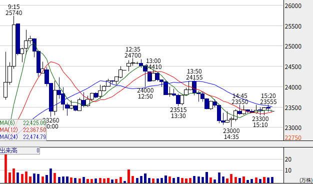 - 朝9:15付近で前日比3,345円高の25,740円の高値を付けた後、急速な利確売りで23,260円まで2,480円も下落