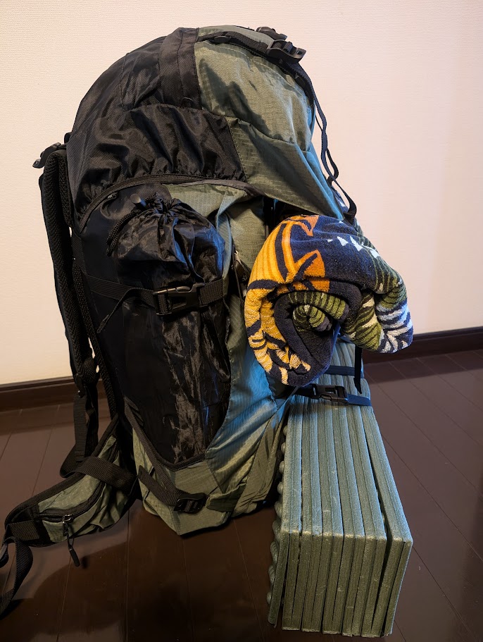 今回は釣りキャンプですので、徒歩キャンプの道具とフカセ釣りの用意をしていきます。