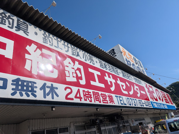 まずは、道中の湯浅町にある「紀の国屋」でオキアミ3kgと集魚剤、夜釣り用に青イソメを購入しました。