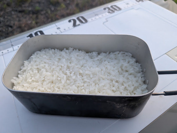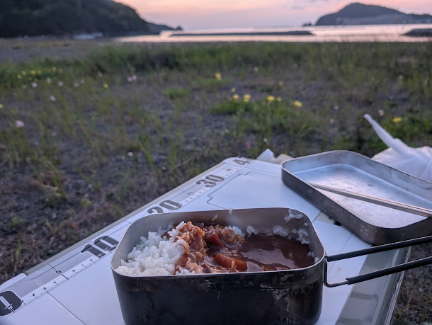 ご飯は小さい方のメスティンで固形燃料で炊いて、レトルトカレーは大きい方のメスティンでアルコールストーブを使って温めています。