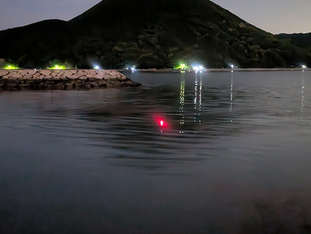 電気ウキを付けて、近くの磯場の先端に移動して釣り開始です。