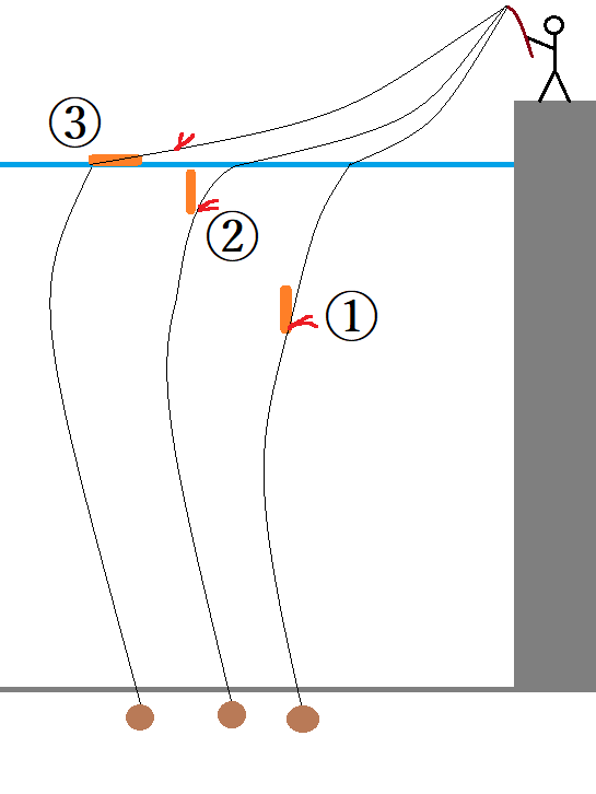 下図で②の状態になるように調整します。①の状態はウキ止めの位置が浅すぎます(次投でタナを深くします)。③の状態はウキ止めが深すぎます(次投でタナを浅くします)。