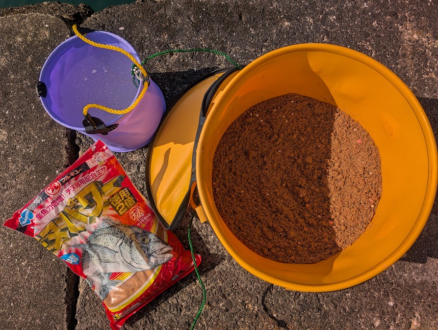 慣れてきたら、自分でヌカと砂を配合したり「アミエビ」や「チヌパワー」などの集魚材を入れても良いのですが、初めのうちはそこまでしなくても良いと思います。