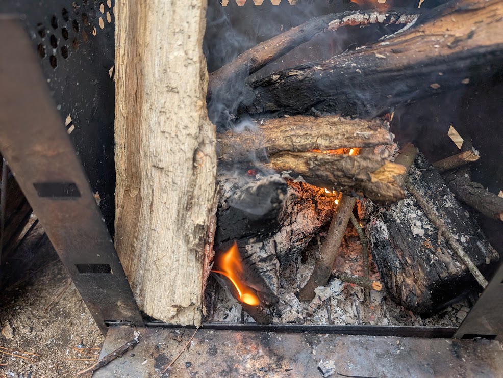 焚き火が消えることなく、長く楽しむためには火が小さくなり過ぎる前に薪を入れた方が良いです(焚き火の温度が下がると、特に広葉樹の場合は火が付きづらい)