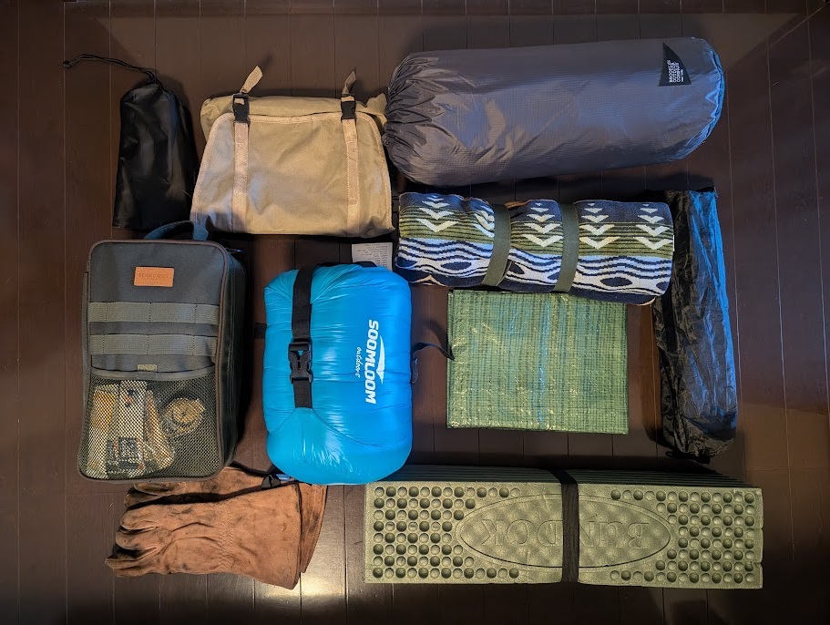 私は今回はグランドシートと長袖のパーカーを入れていきます。(入れるならキャンプ場に着いてすぐに使うものや、出し入れをよくするものがいいかなと思います)