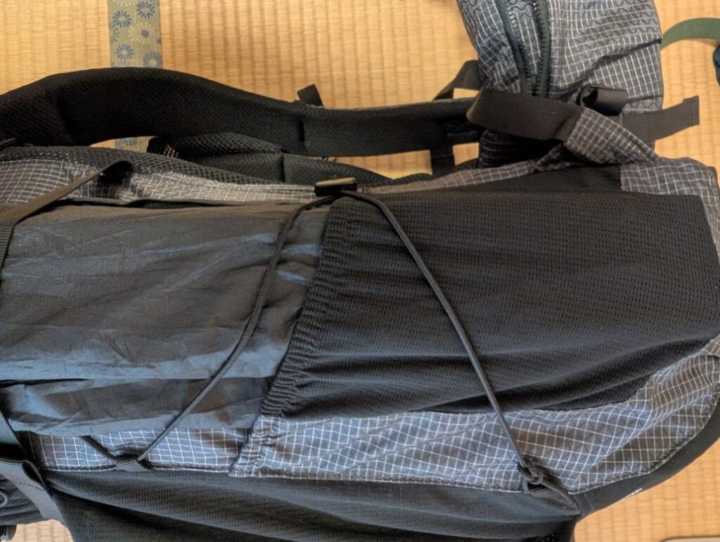 サイドポケットは若干のマチがあり上部はゴムになっています。さらに紐も付いていますのでサイドポケットに入れたものが落ちないように押さえることが出来ます。