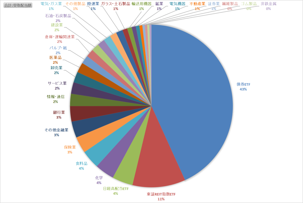 日本の高配当個別株の業種別の受取配当金、日経高配当50ETF(1489)、東証REIT指数ETF(1343)、米国債券ETF(AGG、EDV、LQD、JNK、)の分配金受取額の割合は以下の通りです。