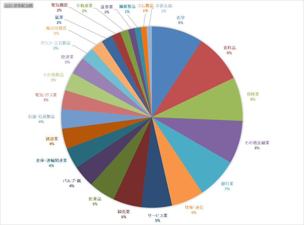 下のグラフは、上のグラフから米国債券ETFと東証REIT指数ETF、日経高配当50ETFを除て個別高配当株の業種別の受取配当金の割合です。