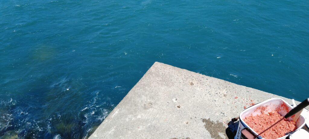 実際の釣行では、上野漁港のポテンシャルの高さを実感しました。 コマセ(撒き餌)を竿から10m先位に撒くと、足元から40cmはありそうな2~3匹の大きなグレが、スーッと沖に向かって出ていく姿が何度も見えたのです。