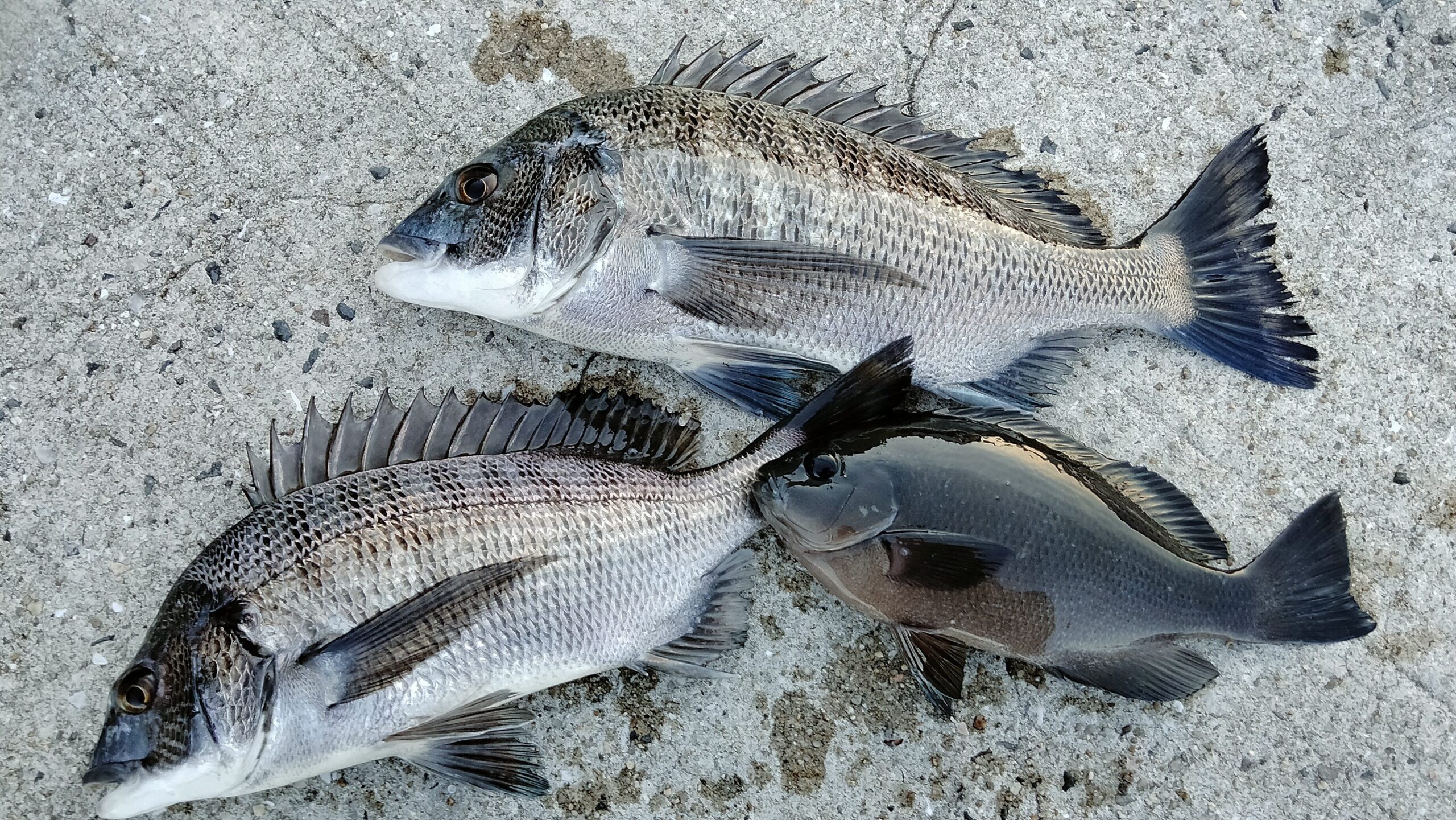 グレ(メジナ)、チヌ(クロダイ)、アオリイカ(墨の跡が多数あり)