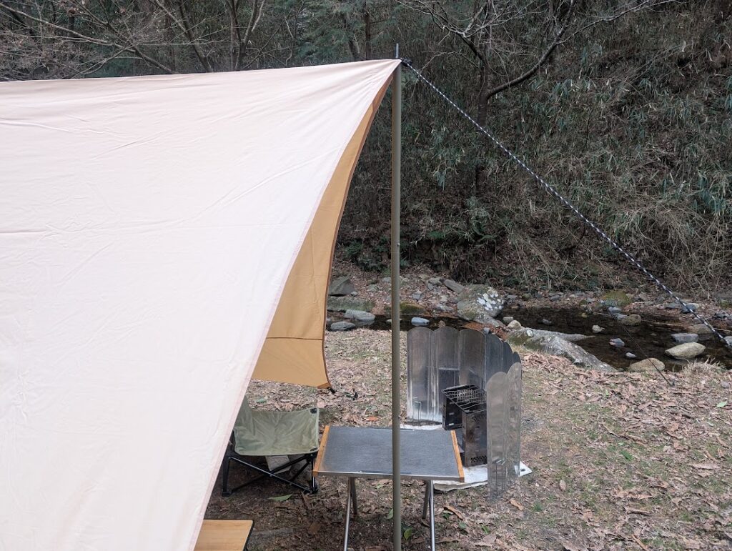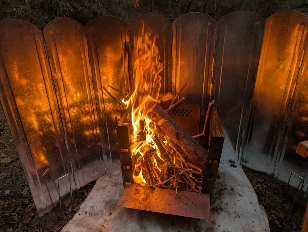 このウインドスクリーンを設置することで、焚き火の前に居ると焚き火の熱が反射されて非常に暖かいです。