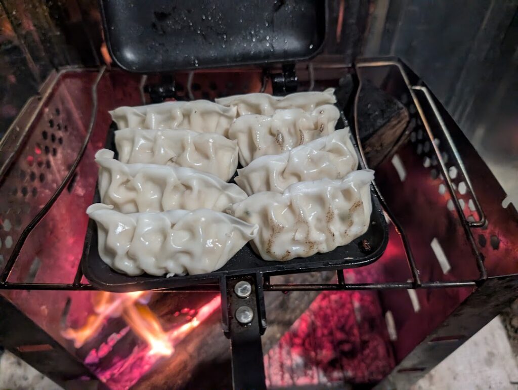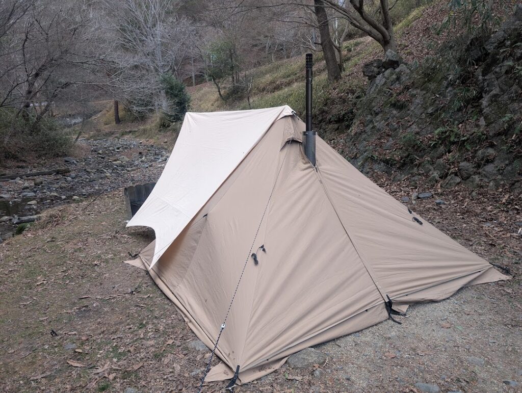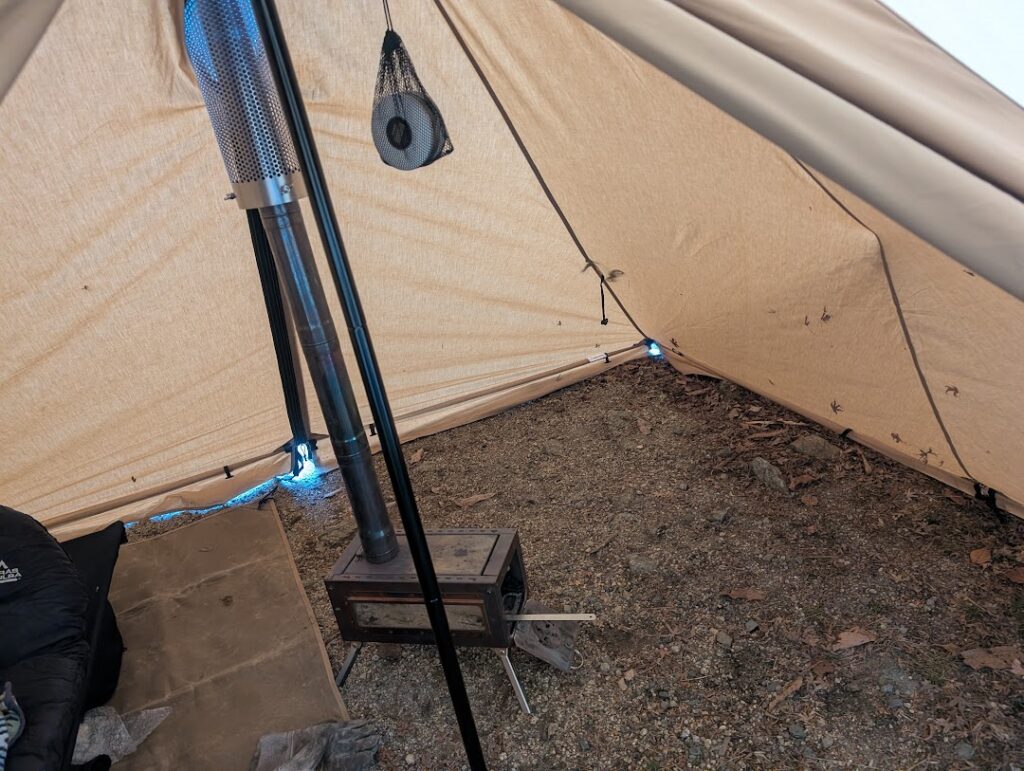 薪ストーブがあれば寒い夜でもテント内で暖かく、お籠りキャンプがはかどります。もちろん一酸化炭素チェッカーも忘れていません。