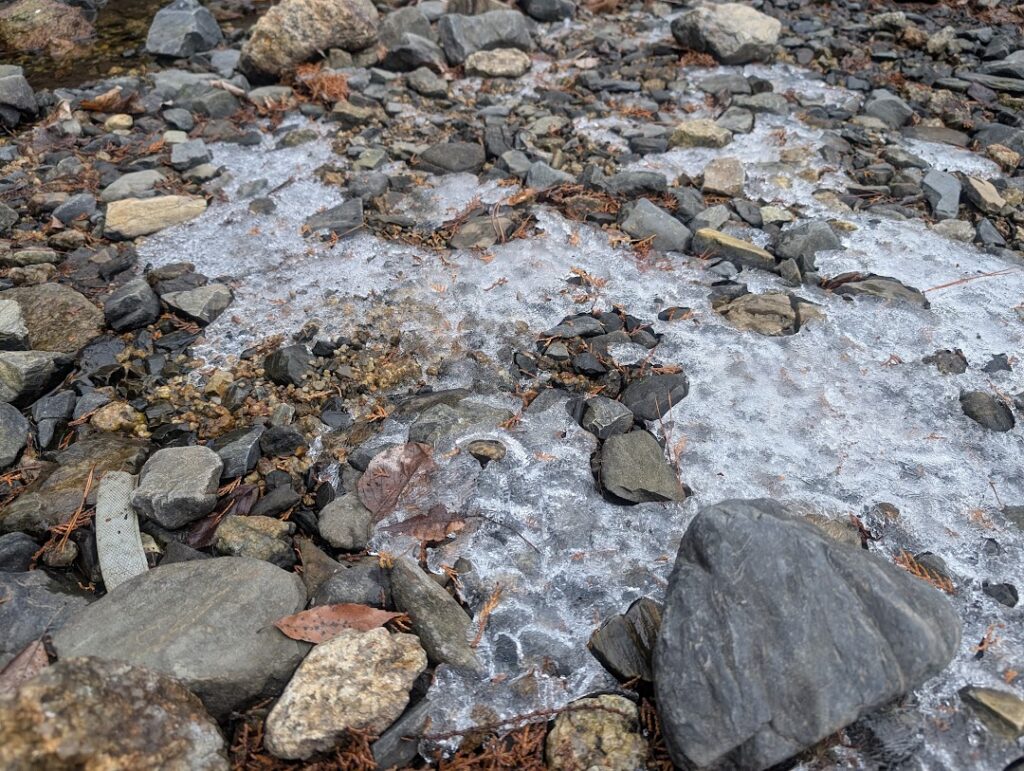 受付前の河原に降りてみると、凍った箇所がありました。前日までの厳しい冷え込みで凍ったのが、まだ溶けていなかったことに少し驚きました。
