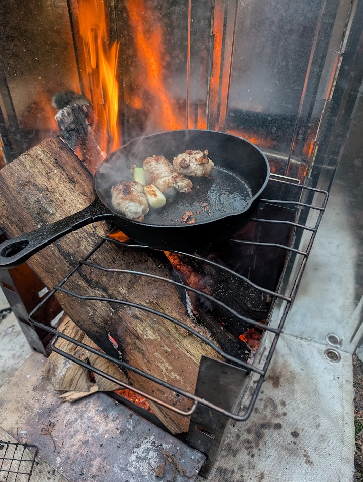 ビールを飲みながら焚き火で料理をしていきます。と言ってもネギと肉を焼いでいるだけですが。。