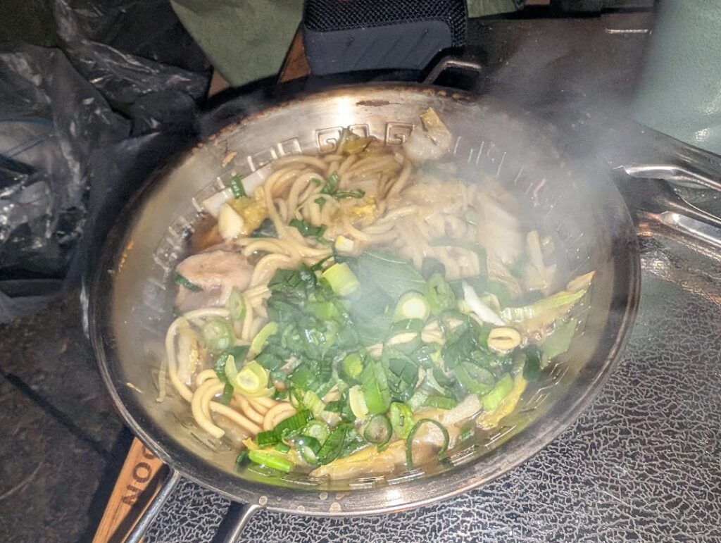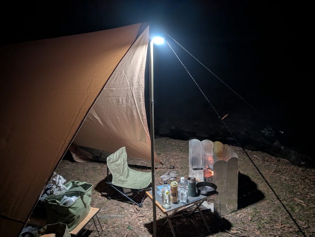 暗くなってからも照明の下で焚き火をしながら、一人で楽しく飲み食いをしています。